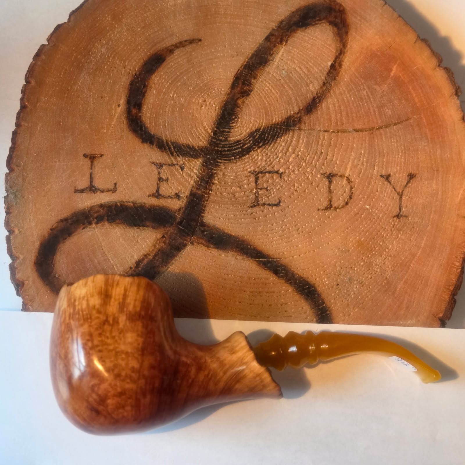 Leedy Large Freehand. British Beige Finish. 3″ tall, 7″ long, bowl diameter is 1″, 2″ deep. Greek Plataue Briar. Lemon Yellow Fancy Lucite Stem.