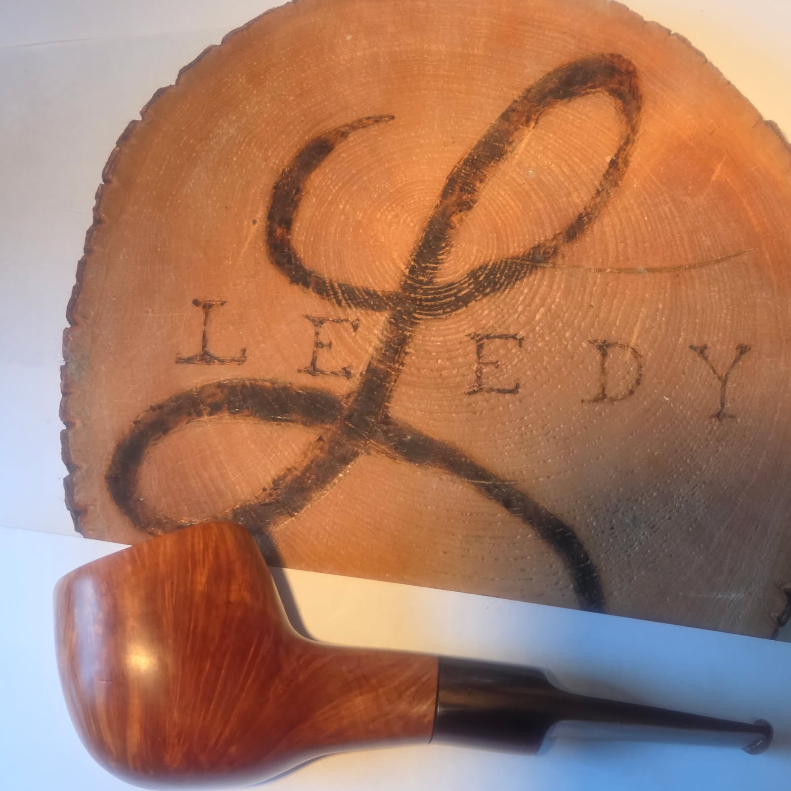 Leedy Large Freehand. Light Brown Finish. 2.5″ tall, 8″ long, 1.75″ deep chamber, chamber is 7/8″ wide. Root Beer Swirl Lucite Stem.