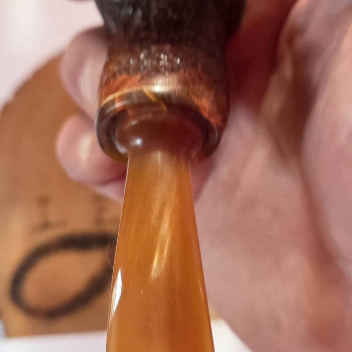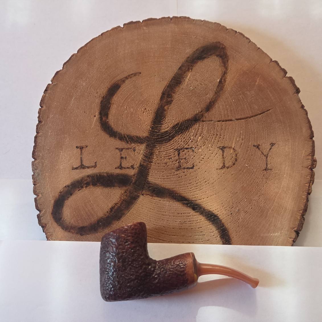 Leedy reverse calabash. Russet brown finish. Caramel plunger stem. 1 1/2″ tall, 3 1/2″ long, 7/8″ chamber width, 1.25″ deep.