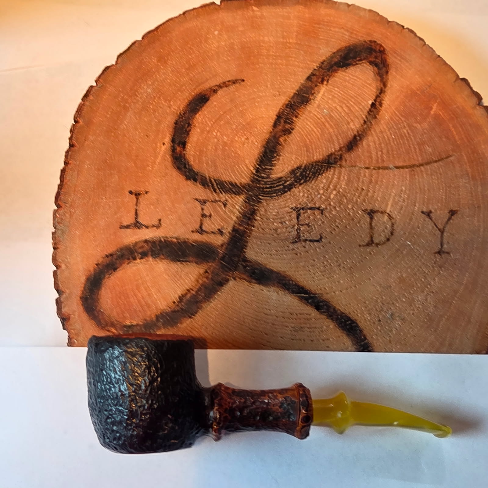 Leedy Rustic Freehand with Indonesian Bamboo shank. 2.25″ tall, 6.5″ long, chamber is 1.75″ deep, 7/8″ in diameter. Italian Ebechaun Briar. USMC Black finish. Lemon Yellow Fancy Lucite stem.
